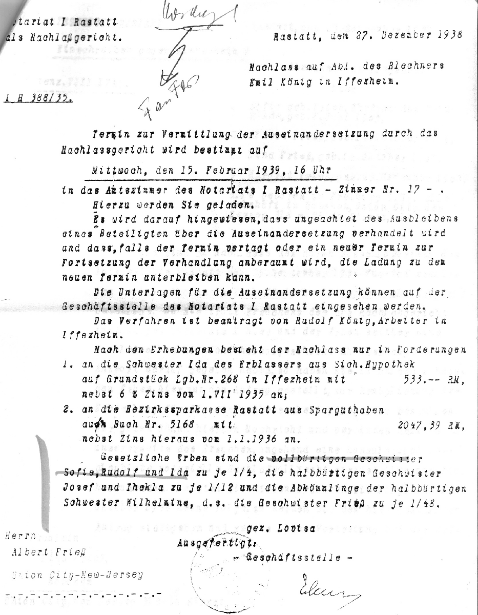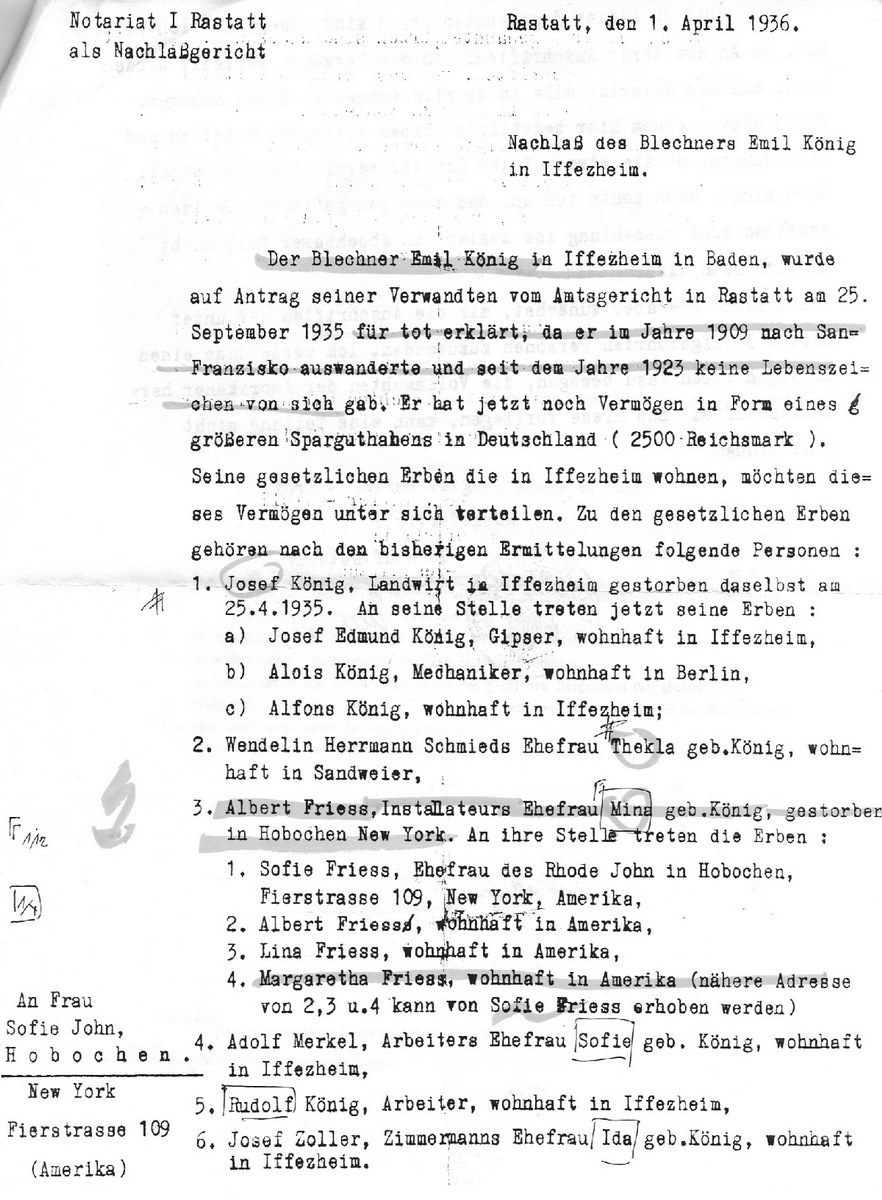 Alan's mother was Margaretha (Grete) Agatha FRIESS (*23.Nov. 1908 in Freiburg/Baden), daughter of Albert Wilhelm FRIESS (*4. March 1880 Tegernau/Baden) and his wife Wilhelmine (Mina) KÖNIG (*about 1885). Up to now we ignored her descent. But further data may be derived from the correspondance concerning the estate of a certain Emil KÖNIG who emigrated to San Francisco in 1909. As since 1923 no sign of him being alife could be noticed by his German family, they had him declared dead in 1935, precondition for distributing his estate - 2500 Reichsmark - left on a bank in Germany.