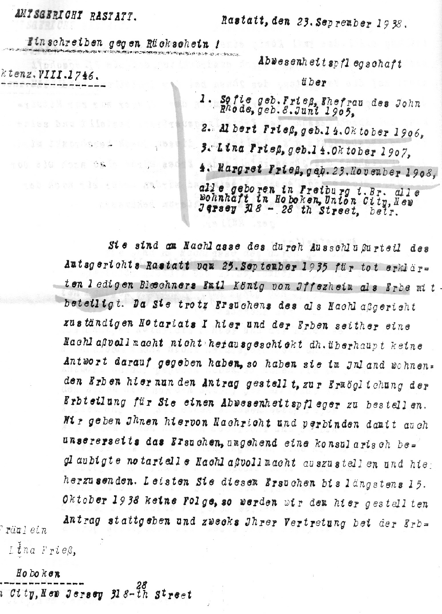 B) Amtsgericht Rastatt, den 23. September 1938. Includes exact birthdays of the four children of Albert's, amidst them Margret FRIESS, born Novembre 23, 1908.