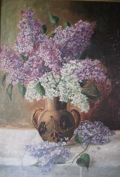 Erika Bachmann (24.5.1886 - 30.12.1970) malte dieses Flieder-Stilleben als Kopie eines Originals bereits mit 22 Jahren. Die Signatur (E.Bachmann 1908) ist auf dieser technisch nicht perfekten Fotografie leider kaum zu sehen. Bildgröße 47,5 x 69,5. Im Besitz von Inge Schweißhelm, geb. Teuthorn.