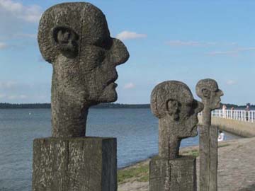 Von mehreren Standorten beobachten überlebensgroße Holzskulpturen den Besucher.